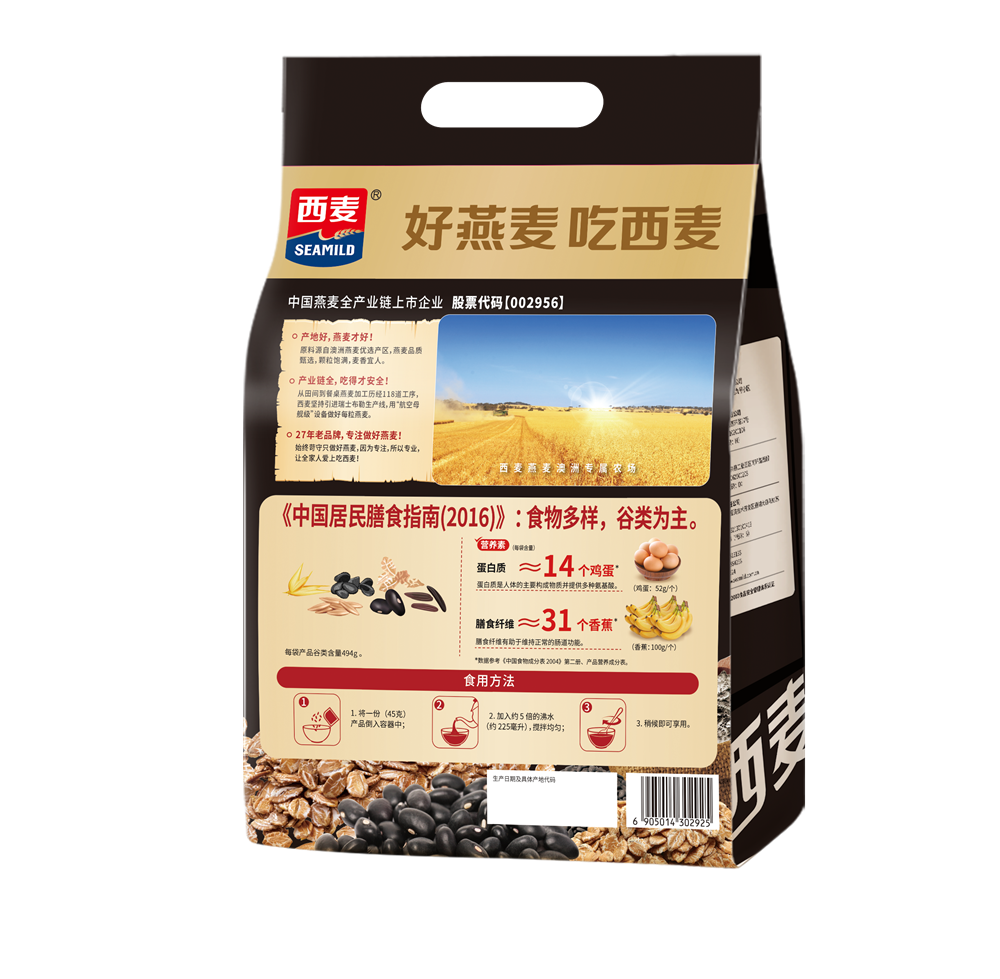 Introduction: Ingredients include triticale, oats, black rice flakes, black bean flakes, rye flakes, and black sesame. Imported oatmeal, steamed and pressed black grains, retains the nutrients of whole grains. No sucrose is added, triticale and rye with very low fat content are used, and fat intake is strictly controlled. From the perspective of nutritional content, every 100g contains 10g of dietary fiber, which is very satiety and helps to maintain normal